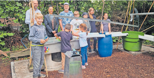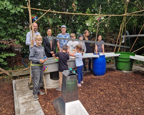 Endlich war es soweit, als am heutigen Donnerstag der neue Wassergarten am Jugendzentrum Bunker eingeweiht wurde. Auf verschiedenen Ebenen läuft dort die schützenswerte Ressource über mehrere Becken und Fässer in ein Edelstahlbecken, von wo es mit Muskelkraft zurückgepumpt werden muss. Auf dem Rückweg warten allerlei Wasserräder und andere spielerische Elemente darauf, durch die Kraft des Wassers angetrieben zu werden. Doch nicht nur kleine Wasserräder sind zu bestaunen, ebenso sind weitere Pumpen und Leitungen im Einsatz.