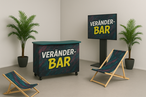 Bei der Veränder-Bar handelt sich um einen professionellen Stand im Messebau-Stil, der einerseits eine gemütliche Landschaft mit Bar, Liegestühlen und Palmendeko bietet. Daneben unterstützt ein separat stehender Touchscreen- PC das Vorhaben, das jungen Menschen hierüber die Möglichkeit gegeben wird, ihre Vorstellungen von Lebenswelt und Zukunft zu visualisieren.